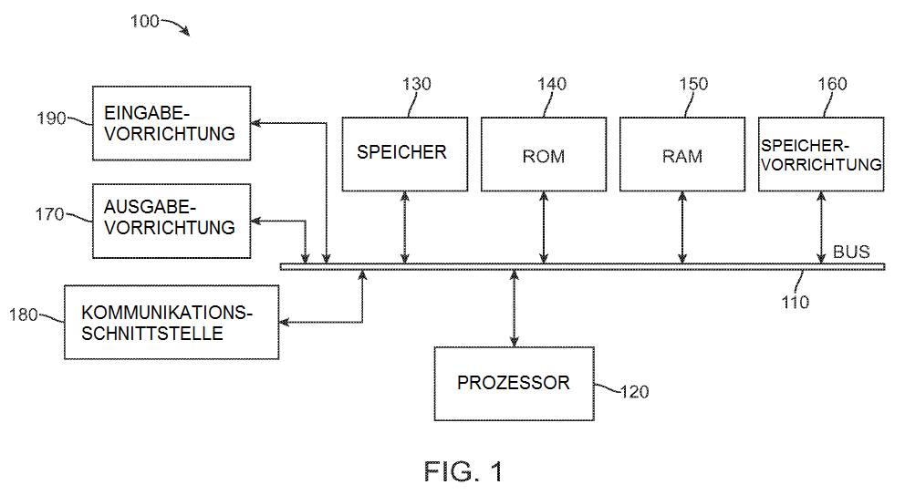 Damit eine Nutzerinteraktion mit dem Computergerät 100 möglich ist, steht die Eingabevorrichtung 190 stellvertretend für eine Vielzahl von Eingabemechanismen, wie etwa ein Mikrofon für Spracheingabe, einen berührungsempfindlichen Bildschirm für Gesten oder grafische Eingaben, eine Tastatur, eine Maus, Bewegungseingaben, Spracheingaben usw. Die Ausgabevorrichtung 170 steht ebenfalls für eine oder mehrere verschiedene Ausgabemechanismen, die dem Fachmann bekannt sind. Gebräuchlich sind beispielsweise Video- oder Audioausgabegeräte, die an Displays oder Lautsprecher angeschlossen werden oder diese enthalten können. Daneben können die Video- und die Audioausgabegeräte auch spezielle Prozessoren für die verbesserte Leistung dieser speziellen Funktionen enthalten. In einigen Fällen ermöglichen multimodale Systeme einem Nutzer, verschiedene Eingabetypen zur Kommunikation mit dem Computergerät 100 zu verwenden. Die Kommunikationsschnittstelle 180 regelt und verwaltet allgemein die Nutzereingaben und die Systemausgaben. Es gibt keine Beschränkung für die offenbarten Verfahren und Geräte, die auf irgendeiner Hardware-Anordnung laufen, weshalb die grundlegenden Merkmale im Zuge der Entwicklung leicht durch verbesserte Hardware- oder Firmware-Anordnungen ersetzt werden können.