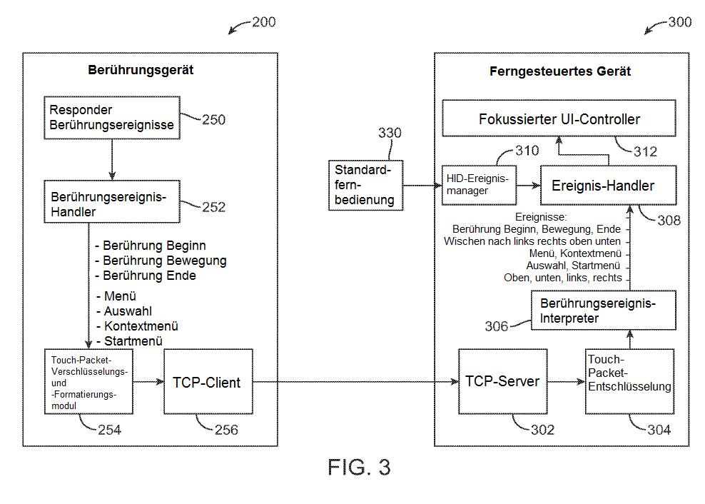 Wie in FIG. 3 dargestellt, empfängt das Berührungsgerät 200 Berührungsereignisse vom Nutzer während ihrer Eingabe mithilfe eines Responder-Berührungsereignismoduls 250, das diese Berührungsereignisse an einen Berührungsereignis-Handler 252 weiterleitet. Der Berührungsereignis-Handler 252 interpretiert die vom Responder-Berührungsereignismodul 250 empfangenen Berührungsereignisse, um Informationen zum Berührungsereignis zu identifizieren. So kann der Berührungsereignis-Handler z. B. die Pixelposition des Berührungsstarts, die Pixelposition des Berührungsendes und die Berührungsbewegung identifizieren. Außerdem kann er die Dauer des Berührungsereignisses interpretieren. Der Berührungsereignis-Handler 252 kann interpretieren, ob das Berührungsereignis zu einer Menüeingabe, einer Auswahlhandlung, einer Kontextmenüeingabe oder einer Startmenüeingabe geführt hat. Diese Informationen werden zu Paketen formatiert, durch das Touch-Packet‑Verschlüsselungs- und -Formatierungsmodul 254 verschlüsselt und durch den TCP-Client 256 an das ferngesteuerte Gerät 300 geschickt.