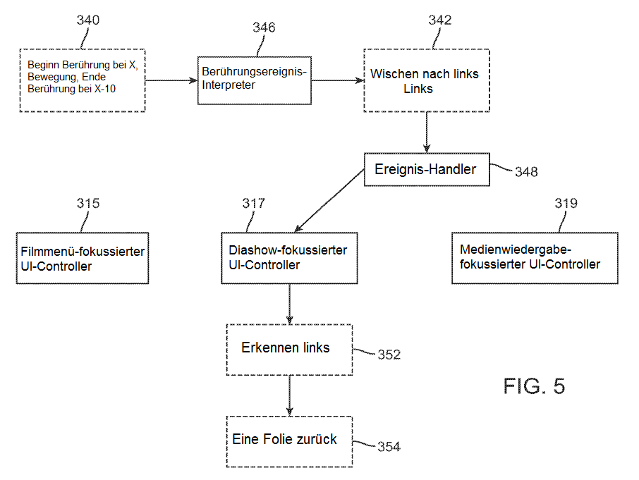 Der Ereignis-Handler 348 leitet das Ereignis "links" und das Ereignis "nach links wischen" an den UI-Controller weiter, der gerade "im Fokus" ist. Ein UI-Controller ist dann "im Fokus", wenn er zumindest einen Teil des gerade angezeigten Bildschirms der Benutzerschnittstelle steuert. Der fokussierte UI-Controller empfängt Ereignisse vom Ereignis-Handler 348. In FIG. 4 bis 6 gibt es drei verschiedene fokussierte UI-Controller. Ein Filmmenü-fokussierter UI-Controller 315, ein Diashow-fokussierter UI-Controller 317 und ein Medienwiedergabe-fokussierter UI-Controller 319. In FIG. 4 empfängt der Filmmenü-fokussierte UI-Controller 315 die Berührungsereignisse 342 vom Ereignis-Handler 348 und erkennt das Ereignis "nach links wischen" bei 344 und veranlasst die UI, scheinbar durch die Auswahl zu scrollen und das Scrollen bei 350 zu beenden. In FIG. 5 ist der Diashow-fokussierte UI-Controller 317 der aktive Controller und erkennt das Ereignis "links" bei 352, was dazu führt, dass die Benutzerschnittstelle bei 354 zur vorangehenden Folie in der Diashow zurückkehrt. In FIG. 6 ist der Medienwiedergabe-fokussierte UI-Controller 319 der aktive Controller und erkennt das Ereignis "nach links wischen" bei 356, was dazu führt, dass die Benutzerschnittstelle bei 358 zur vorangehenden Folie in der Diashow zurückkehrt. In FIG. 4 bis 6 wird dargestellt, wie dieselbe Berührungseingabe als jeweils anderes Ereignis erkannt werden kann und wie die fokussierten UI-Controller eine Auswahl aus den Ereignissen treffen, um eine Aktion in der Benutzerschnittstelle auszulösen.