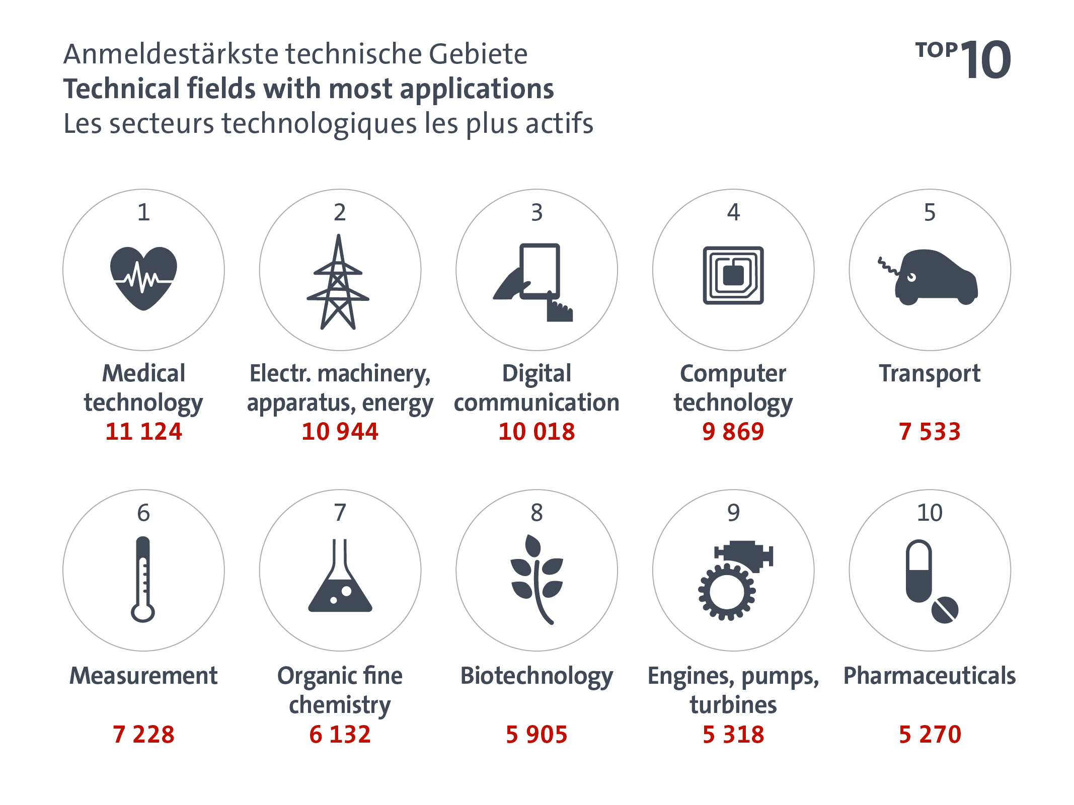 In neun der zehn anmeldestärksten Technologiefelder stammten 2014 die meisten Patentanmeldungen von Firmen aus Europa. Dies belegt die Stärke der europäischen Wirtschaft in der Entwicklung innovativer Technologien und verdeutlicht die Breite des europäischen Patentportfolios: In der Medizintechnik, dem anmeldestärksten Technologiefeld, konnten die Europäer weiter zulegen (+3,3%) und mit einem Anteil von 41% ihren Vorsprung auf die US-Unternehmen (39%) behaupten. Die größten Zuwächse verzeichneten europäische Unternehmen in der Biotechnologie (+15,9%) bei einem Anteil von 56% am Total, im Bereich Digitale Kommunikation (+12,5%) mit einem Anteil von 38% und in der Messtechnik (+9,8%) mit einem Anteil von 55%. Zudem waren die europäischen Firmen im Transportwesen mit einem Anteil von 59% (+2,4%), insbesondere im Automobilsektor und in der Luftfahrt, sowie bei elektrischen Maschinen mit einem Anmeldewachstum von 6,9% (47%-Anteil) dominierend. Nur bei Computern hatten europäische Firmen mit einem Anteil von 29% gegenüber den USA (38%) das Nachsehen. ( Fig. 6: Die anmeldestärksten technischen Gebiete )
