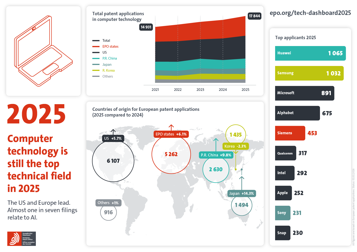 While the US accounted for the largest overall share of computer technology applications, European innovators preserved a narrow lead in AI. They also stayed well ahead in quantum computing, where they posted strong growth (+22.1%), despite a surge in US filings (+43.3%) and, from a lower base, those from Japan (+170.8%).