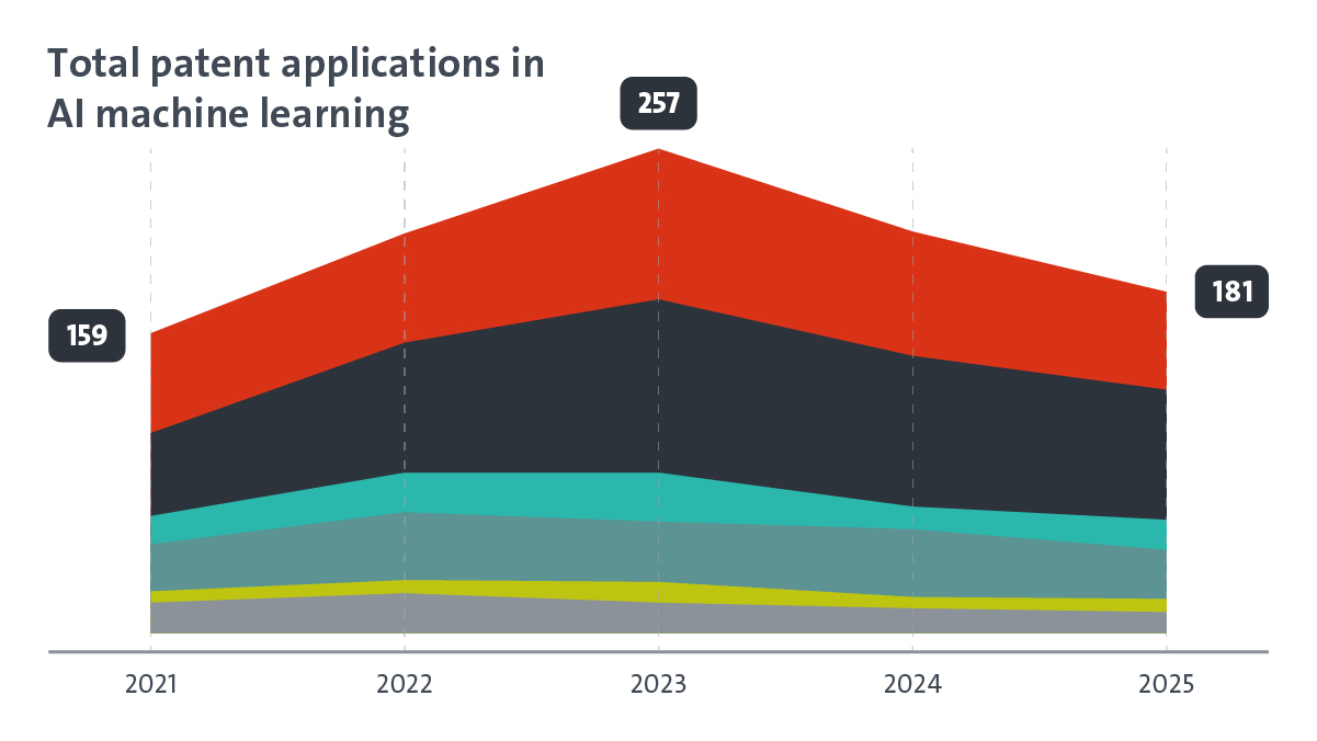Machine learning enables systems to learn patterns directly from data and is used in sectors such as healthcare diagnostics, infrastructure management, financial markets and public administration. For the moment, innovation in this area seems to have peaked in 2023. By 2025, Europe’s share had stabilised at almost 30% of filings, remaining consistently behind US innovators, with the exceptions of 2019 and 2021.