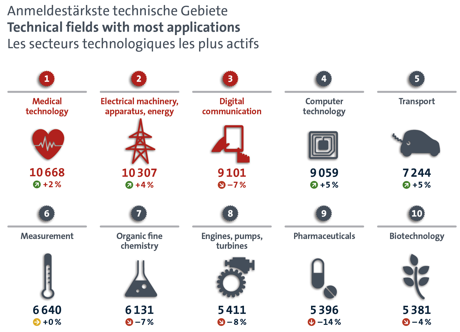 In terms of growth, filings were up in Computer technology (+5%), Transport (+5%) and Electrical machinery (+4%), while Pharmaceuticals (-14%), Engines, pumps, turbines (-8%), Organic fine chemistry (-7%), Digital communication (-7%), and Biotechnology (-4%) decreased.