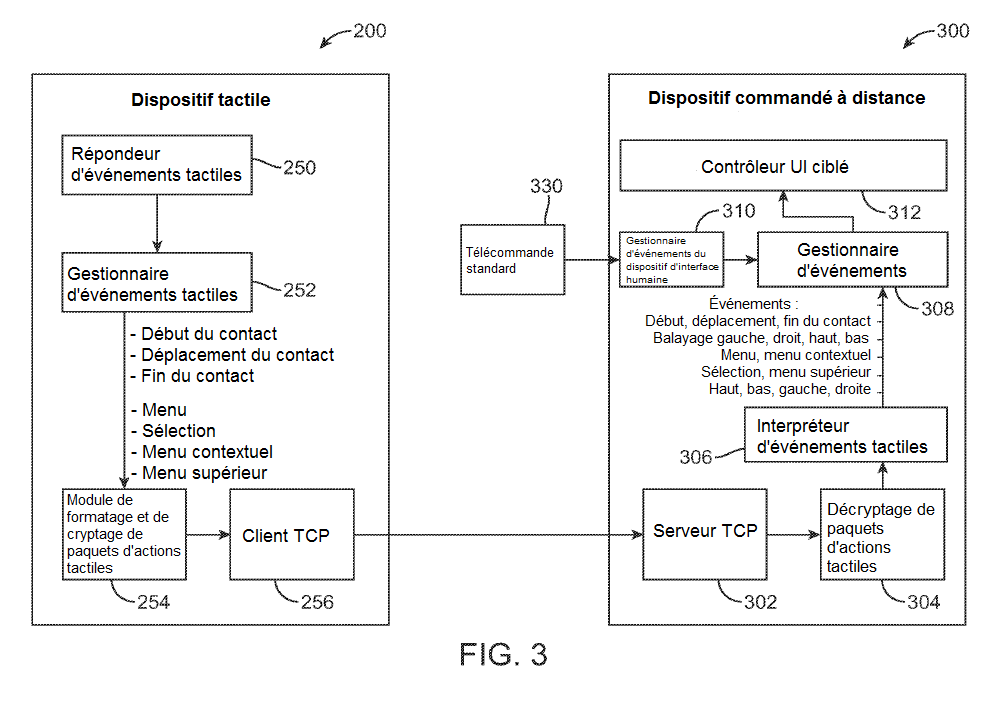 Comme le montre la figure 3, le dispositif tactile 200 reçoit des événements tactiles de l'utilisateur, entrés via un répondeur d'événements tactiles 250, lequel transmet les événements tactiles au gestionnaire d'événements tactiles 252. Le gestionnaire d'événements tactiles 252 interprète les événements tactiles reçus par le répondeur d'événements tactiles 250 afin d'identifier les informations relatives à l'événement tactile. Par exemple, le gestionnaire d'événements tactiles peut identifier les pixels où le contact a démarré et où il s'est terminé et déterminer le mouvement du contact. Ce gestionnaire interprète également la durée de l'événement tactile. Le gestionnaire d'événements tactiles 252 peut interpréter si le contact a donné lieu à une entrée de menu, une action de sélection, une entrée de menu contextuel ou une entrée de menu supérieur. Ces informations sont constituées en paquets et cryptées par le module de formatage et de cryptage des paquets d'actions tactiles 254 et envoyées par le client TCP 256 au dispositif commandé à distance 300.