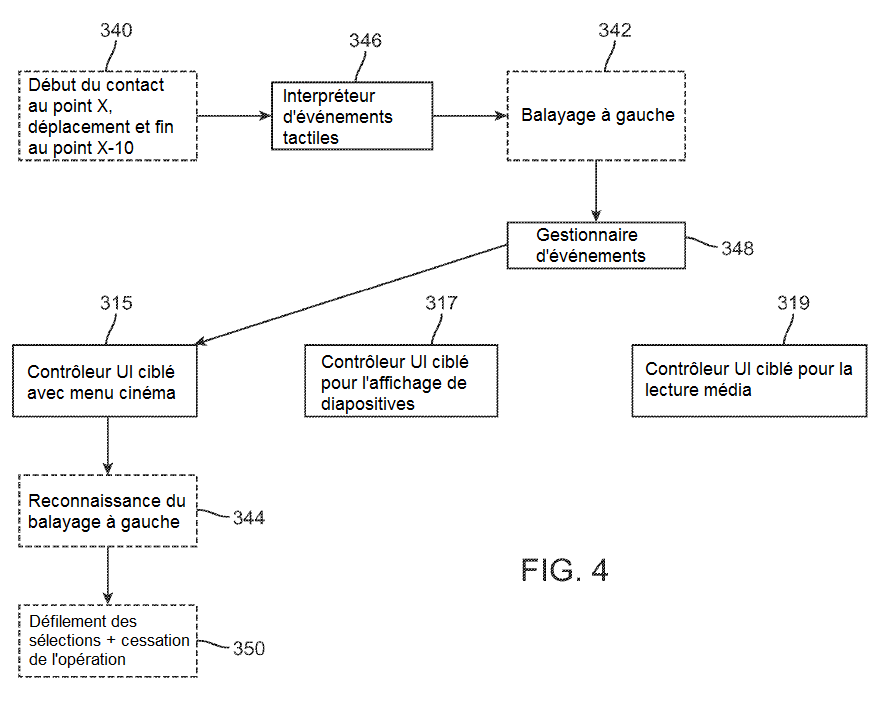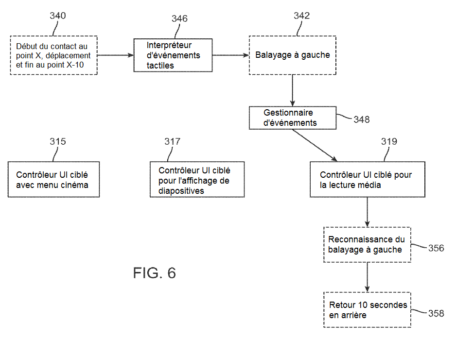 Le gestionnaire d'événements 348 transmet l'événement à gauche et l'événement de balayage à gauche au contrôleur UI qui est actuellement "ciblé". Un contrôleur UI est dit "ciblé" lorsqu'il contrôle au moins une partie de l'écran de l'interface utilisateur affiché. Le contrôleur UI ciblé reçoit les événements du gestionnaire d'événements 348. Sur les figures 4 à 6, il existe trois contrôleurs UI ciblés différents : le contrôleur UI ciblé avec menu cinéma 315, le contrôleur UI ciblé pour l'affichage de diapositives 317 et un contrôleur UI ciblé pour la lecture média 319. Sur la figure 4, le contrôleur UI ciblé avec menu cinéma 315 reçoit les événements tactiles 342 du gestionnaire d'événements 348 et reconnaît le balayage à gauche (344) et a pour effet que l'UI fait défiler les sélections et cesse l'opération de défilement (350). Sur la figure 5, le contrôleur UI ciblé pour l'affichage de diapositives 317 est le contrôleur actif et reconnaît l'événement à gauche (352), lequel entraîne un retour de l'interface utilisateur à la diapositive précédente dans l'affichage des diapositives (354). Sur la figure 6, le contrôleur UI ciblé pour la lecture média 319 est le contrôleur actif et reconnaît l'événement de glisser à gauche (356), lequel entraîne un retour de l'interface utilisateur à la diapositive précédente dans l'affichage des diapositives (358). Ensemble les figures 4 à 6 montrent comment la même entrée tactile peut être reconnue comme plusieurs événements différents et comment les contrôleurs UI ciblés choisissent parmi ces événements pour générer une action dans l'interface utilisateur.