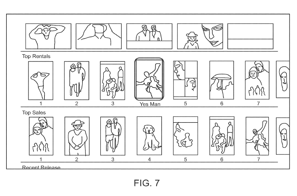Pour revenir à l'exemple d'une application multimédia exécutée sur une télécommande – dans un contexte de menu, un utilisateur peut éventuellement naviguer dans les médias, par titre, artiste, type de média, sélections de morceaux, nom d'album, genre (il convient de comprendre que certaines de ces catégories de navigation dans les médias sont plus ou moins applicables à différents types de médias, par exemple : films ou chansons). Dans l'exemple représenté sur la Figure 7, l'utilisateur peut naviguer dans l'interface de menu, parmi les titres de films organisés sous forme de liste. Dans le contexte de menu, différentes entrées peuvent être saisies dans la zone tactile principale pour naviguer dans le menu et procéder à une sélection. Par exemple, comme indiqué dans le tableau ci-dessous, un utilisateur peut faire glisser l'interface dans une direction souhaitée, ce qui peut entraîner une opération de défilement. Selon l'état de l'art, la vitesse du geste et l'opération de défilement peuvent être liées. Par exemple, un geste de balayage plus rapide peut entraîner une opération de défilement plus rapide et/ou un défilement de plus longue durée. En outre, la zone tactile principale peut également recevoir des tapotements, qui peuvent sélectionner un élément. Par ailleurs, en déplaçant son doigt sur la zone tactile principale 204, l'utilisateur peut déplacer un élément sélectionné ou mis en surbrillance.