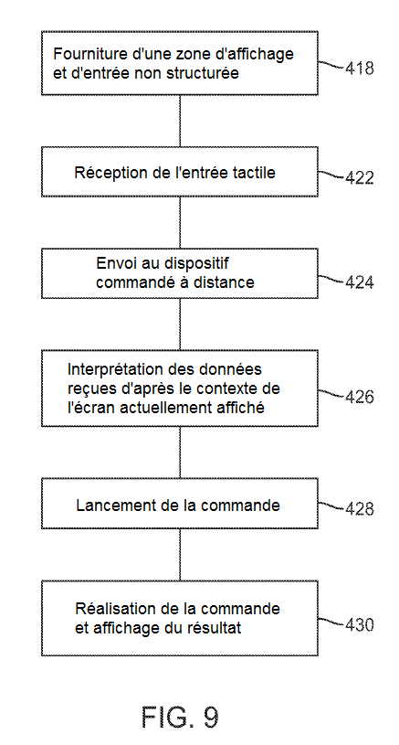 La figure 9 représente le procédé de contrôle de la télécommande. À l'étape 418, une application à distance fournit une zone tactile non structurée pour recevoir les entrées tactiles d'un utilisateur. Les entrées tactiles sont reçues et traduites au moins en éléments suivants : début de l'événement tactile, fin de l'événement tactile, données de mouvement et de durée à l'étape 422. Les données sont mises en forme et envoyées au dispositif commandé à distance à l'étape 424.