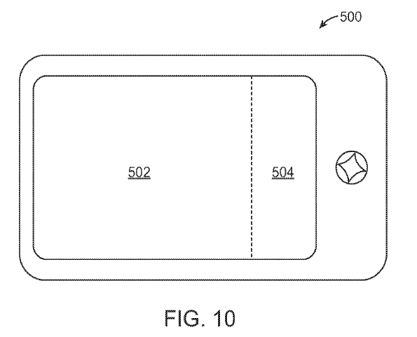 Plusieurs procédés peuvent être utilisés pour empêcher les entrées non intentionnelles. L'un d'entre eux, comme décrit ci-dessus, utilise un accéléromètre pour déterminer l'orientation des dispositifs et se base sur le fait que l'orientation détermine le type de commande que l'utilisateur tente d'entrer. Si le dispositif est horizontal, l'utilisateur ne regarde probablement pas le dispositif et les gestes sont vraisemblablement destinés à commander le dispositif commandé à distance. Cependant, si le dispositif est plus vertical ou incliné de manière à ce que l'utilisateur puisse regarder l'écran, l'utilisateur regarde probablement l'écran et les entrées se font plus vraisemblablement par les boutons d'interface structurés. Une autre possibilité est représentée sur la figure 5 où la télécommande 500 est tournée en mode paysage. Dans cette orientation, l'ensemble de l'interface n'est pas structuré et seules la zone de sélection principale 502 et la zone de sélection du menu 504 sont présentes. Ce mode de réalisation éliminerait les entrées non intentionnelles en supprimant la partie structurée de l'interface lorsque l'utilisateur souhaite utiliser uniquement l'interface non structurée pour entrer les gestes tactiles visant à commander le dispositif commandé à distance. Lorsque le dispositif est tourné en mode portrait, une interface structurée peut être disponible. Un autre moyen de réduire les entrées non souhaitées est de tourner la partie de l'affichage de l'écran tactile complètement, quelle que soit l'orientation du dispositif. Dans ces modes de réalisation, seules les entrées non structurées dans la zone de sélection principale et dans la zone de menu seraient disponibles. Si l'utilisateur souhaitait l'une des options structurées, l'écran pourrait être retourné par un mécanisme quelconque d'actionnement comme un bouton matériel, le fait de secouer le dispositif, ou par un geste tactile.