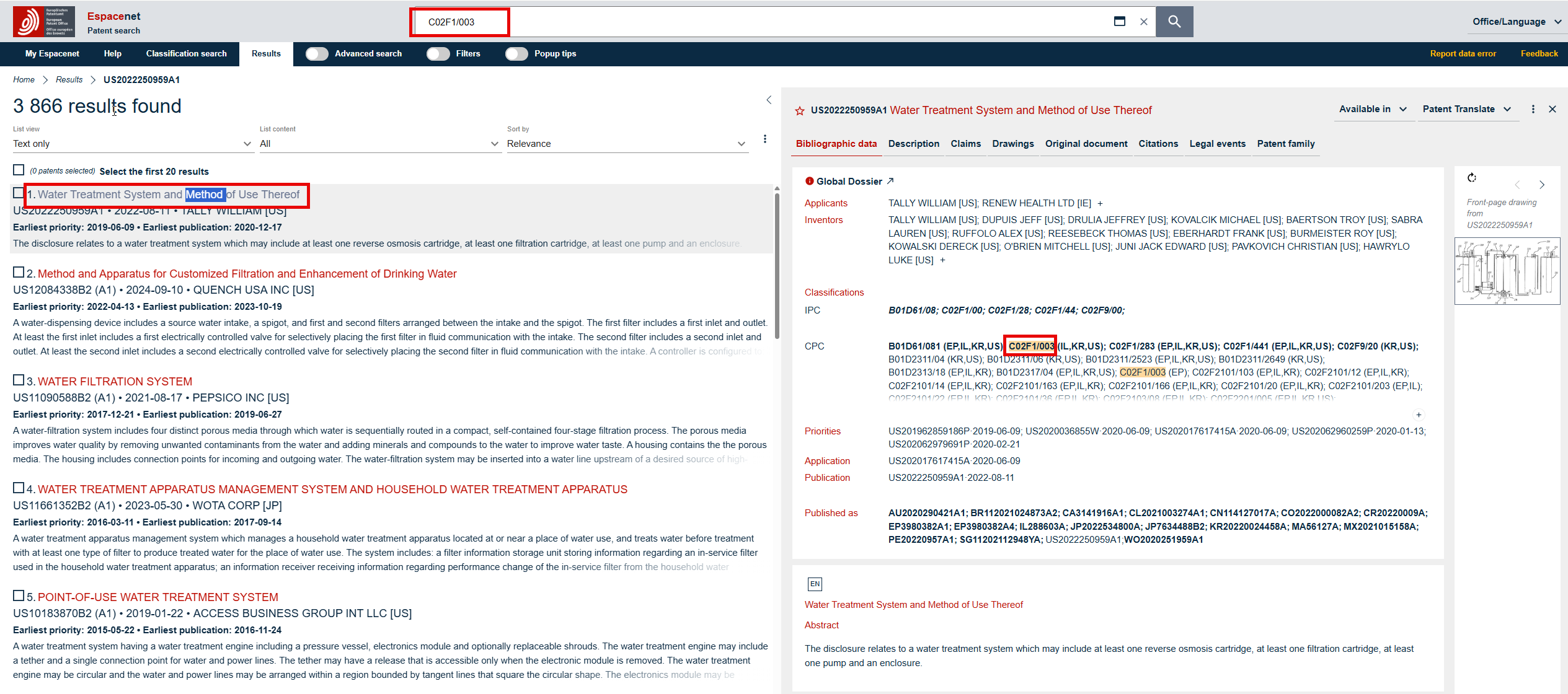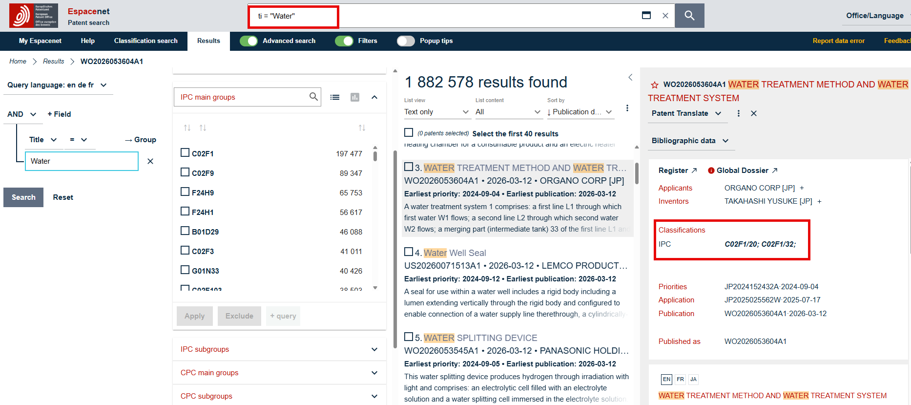 A particularly powerful approach involves searching patents using the Cooperative Patent Classification (CPC) system. CPC-based searching enables precise retrieval of water-related technologies by organising inventions into detailed technical categories, such as water purification processes, desalination, wastewater recycling, leak detection, smart irrigation and climate-resilient infrastructure. Unlike keyword searches—which may miss relevant inventions due to terminology differences or language variations—CPC searches capture technologies based on their technical substance.